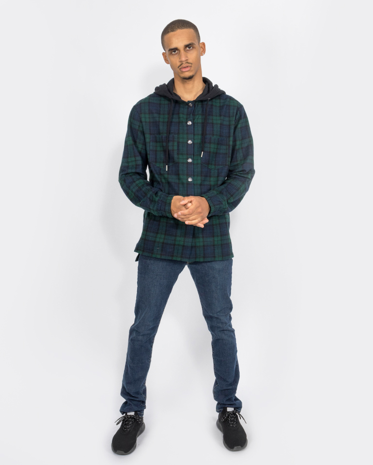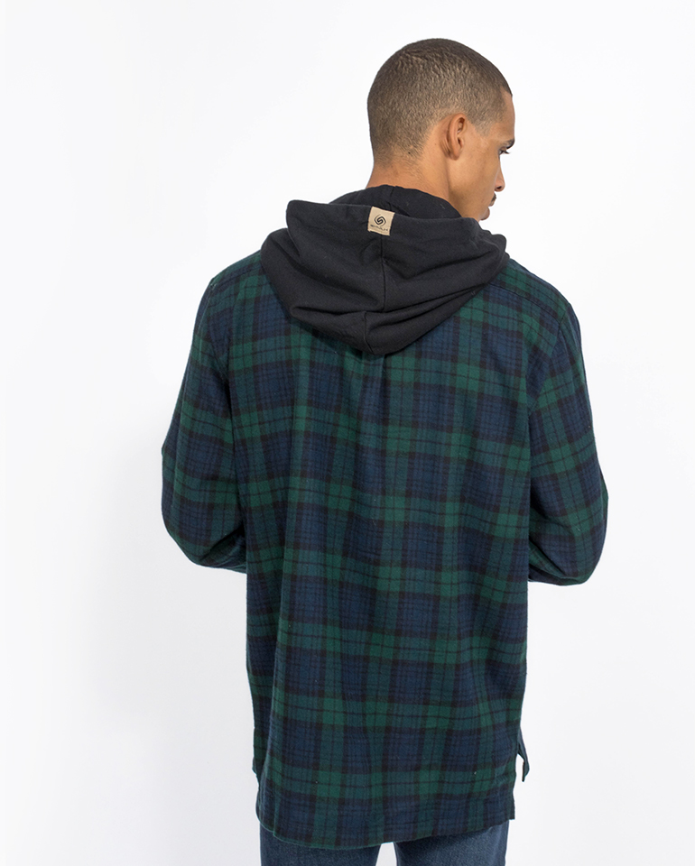 O casaco Plaid DG tem o capuz de um hoodie, o ajuste de uma camisa, mas é tão quente quanto um casaco.